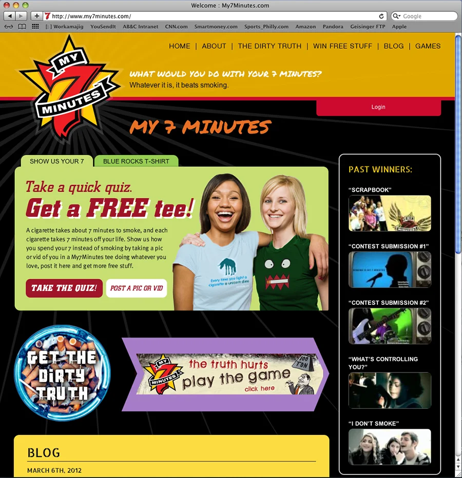 It takes 7 minutes to smoke a cigarette and each cigarette smoked takes 7 minutes off the end of your life. This fact became the basis of a campaign to get teens to use their 7 minutes more wisely. This campaign consisted of several tv spots, a website, t-shirts, mall advertising, online ads, 5 custom-made online games and posters in schools.